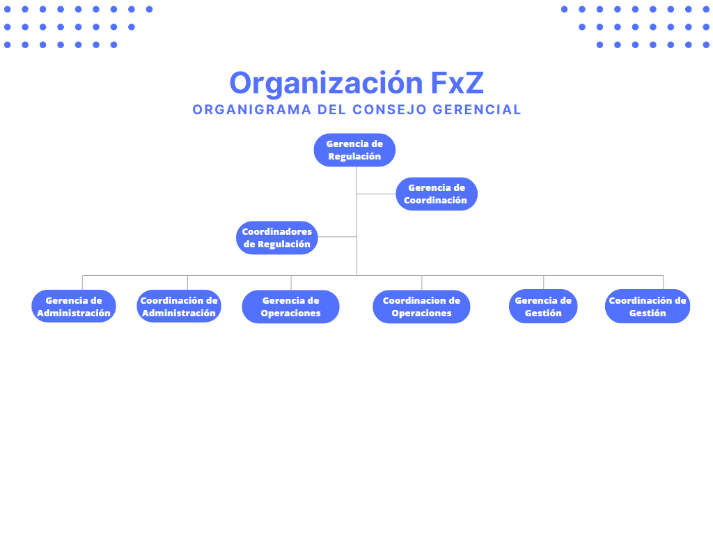 El Consejo Gerencial está encabezado por el Gerente de Regulación y el Gerente de Coordinación, quienes cuentan con el respaldo de los Coordinadores de Regulación. Este consejo incluye a los líderes de los otros tres departamentos: